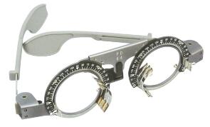 試鏡架是驗光配鏡的基本工具之一,每次插片驗光都必須用到它。它具有一個眼鏡架式的框架,在框架兩個圓圈的正面各配設兩個試鏡坐腳。試鏡架是在綜合驗光儀進行主覺驗光之后使用的,雖然綜合驗光儀得到的結果已經(jīng)較準確,但還必須再用試鏡架技術進行適當?shù)恼{(diào)整,因為試鏡架比綜合驗光儀更接近于實際佩戴情形。